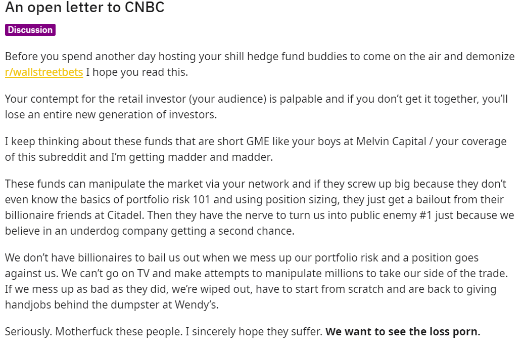 WSB的赌徒们也发帖斥责声援华尔街的媒体。