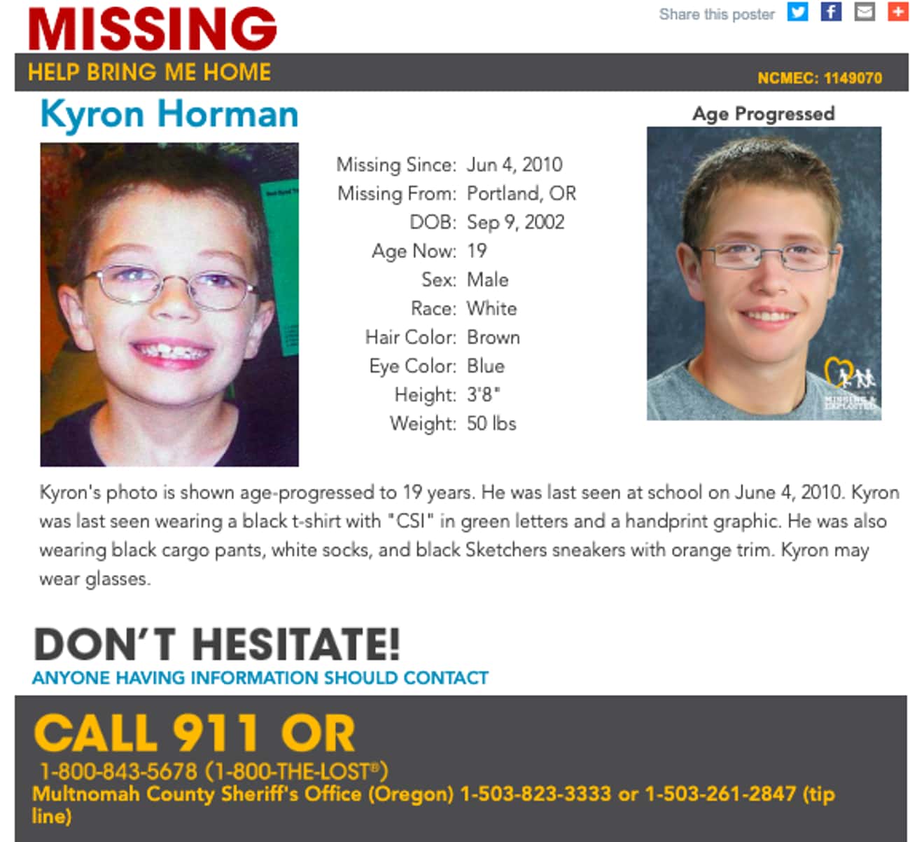 凯伦·霍尔曼的父母Kaine Horman和Desiree Young,在他出生前不久就离婚了。2007年,霍尔曼(Kaine Horman)与莫尔顿(Terri Moulton)结婚,一年后,他们有了一个女儿基亚拉。由于亲生母亲(Desiree Young)的健康问题,霍尔曼和莫尔顿拥有凯伦·霍尔曼的全部监护权。那天放学后,当他们去车站接他时,他们被告知他从来没有上过公交车。在给学校打电话后,他们得知凯伦·霍尔曼被标记缺课。很快警方接到报警,并在学校周围的树林里展开了大范围的搜查。这是俄勒冈州历史上规模最大的一次搜索,但没有得到任何答案。